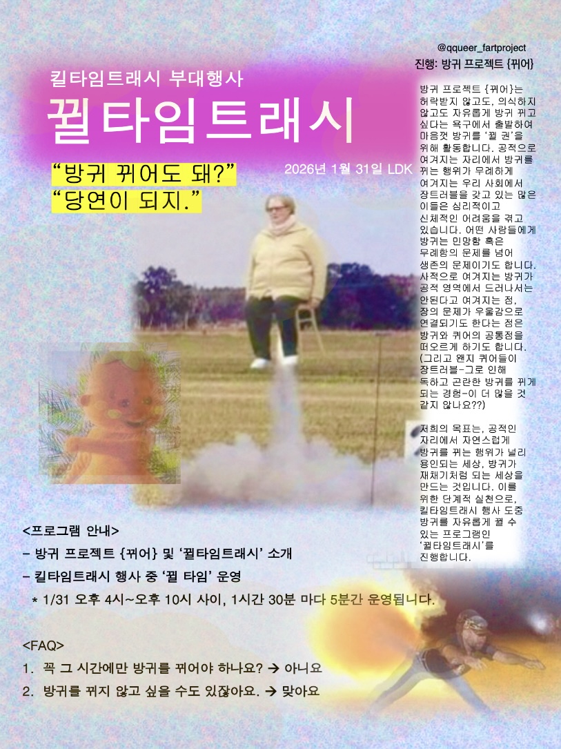 저희의 목표는, 공적인 자리에서 자연스럽게 방귀를 뀌는 행위가 널리 용인되는 세상, 방귀가 재채기처럼 되는 세상을 만드는 것입니다. (Bless u!) 이를 위한 단계적 실천으로, 킬타임트래시의 부대행사로 방귀를 자유롭게 뀔 수 있는 프로그램인 ‘뀔타임트래시’를 진행합니다.